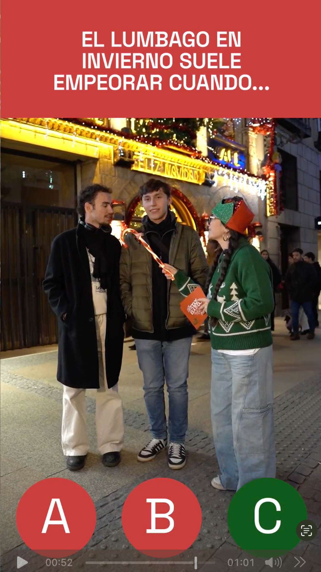 En las entrevistas de calle planteamos preguntas breves, cercanas y con un punto de humor, conectadas con el contexto navideño, para explorar qué cree la gente sobre el frío, los cambios de hábitos en invierno y su relación con el dolor articular y las enfermedades reumáticas. Combinamos formatos tipo test, “verdadero o falso” y preguntas de situación para desmontar mitos y activar conversación en plena calle.